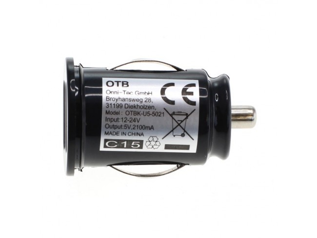 Kvaliteten univerzalni stabilizirani avtomobilski polnilec / adapter proizvajalca OTB. Primeren je za polnjenje različnih naprav (kamere, mobilni telefoni, tablični računalniki ipd.) prek USB priključka. Polnilec / adapter se priklopi v standardno 12V avtomobilsko vtičnico. USB kabel ni priložen. Največji izhodni tok je 2,1 A. Naprava ima zaščito pred prepolnjenjem, nadtokovno in temperaturno zaščito ter certifikate CE in RoHS.
