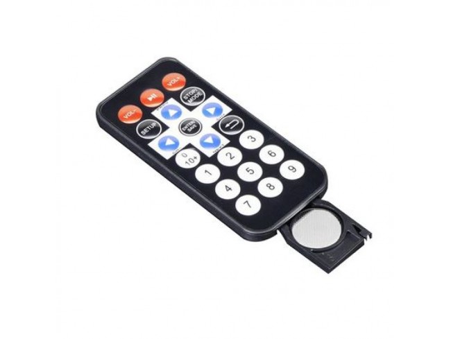 Ta mali daljinski upravljalnik bi bil primeren za nadzor robota ipd. Ima 21 gumbov in priročno postavitev: smerni gumbi in gumbi za vnos številk. Daljinec uporablja vrsto kodiranja NEC in pošilja podatkovne kode 0 do 26 (preskoči # 3, # 7, # 11, # 15, # 19 in # 23) na naslov # 0. To lahko uporabite za nadzor nečesa, kar pričakuje kode NEC.