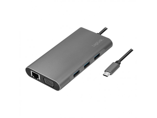 Priklopna postaja USB-C => 3x USB tip A 1xUSB-C PD 100W 1x HDMI 1x VGA1x RJ45 1x 3,5mm avdio 1x čitalec kartic SD/microSD LogiLink (UA0383) EOLS-P